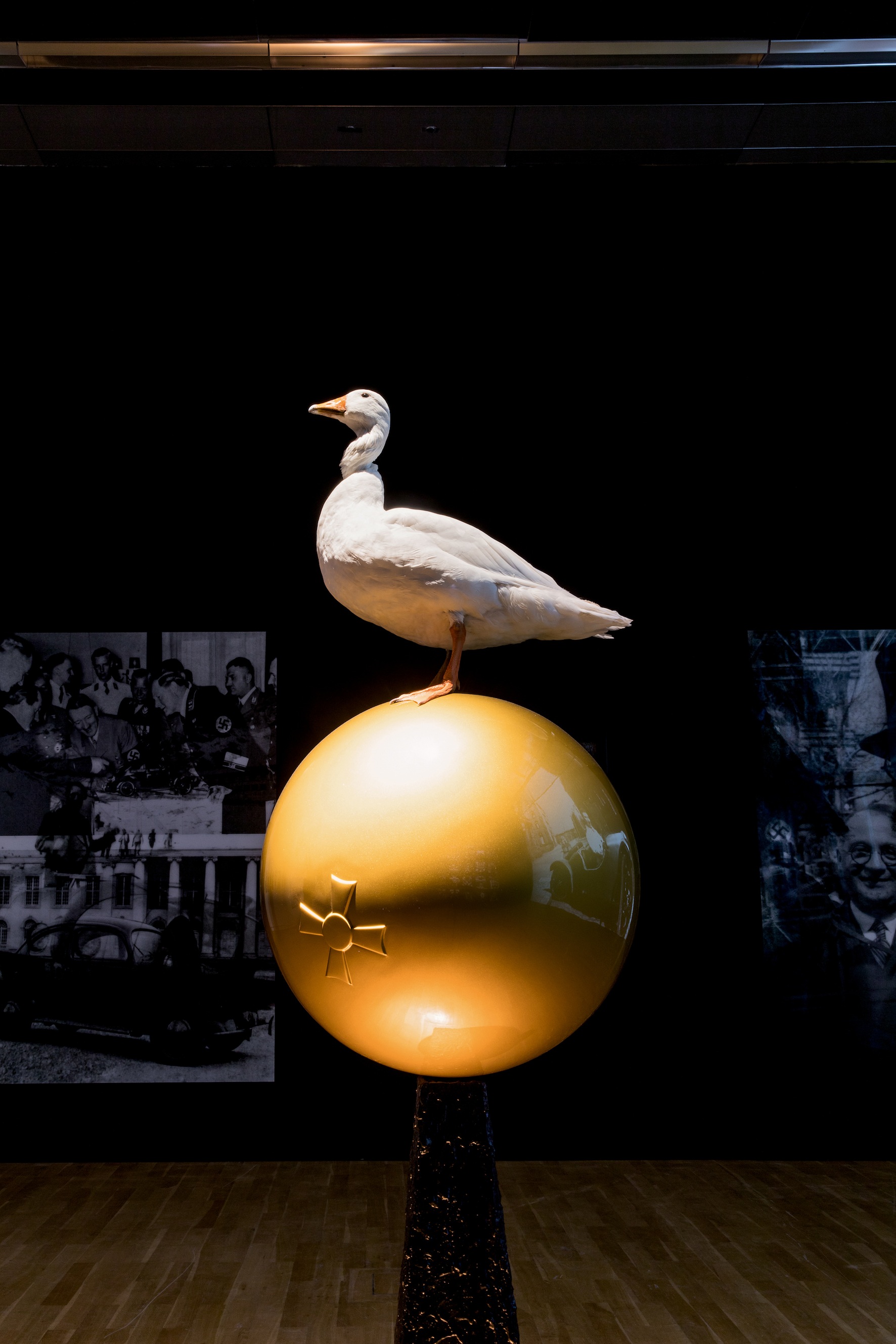 Stadt und Kunst, Geschichte und Fiktion. Exemplarisch kommen am Ende diese Themen noch einmal zusammen. Der Künstler Rémy Markowitsch widmet einen Raum der Biografie von Josef Ganz (1898–1967) – jenem genialen ungarisch-jüdischen Ingenieur, Journalisten und Automobilentwickler, der den „Maikäfer“ erfand. Technische Ähnlichkeiten legen nah, dass dieser zum Vorbild für den VW-Käfer wurde. Josef Ganz jedoch geriet 1933 in die Fänge der Gestapo, floh erst nach Liechtenstein und später in die Schweiz, von wo er nach dem Krieg wieder ausgewiesen wurde. Seine Lebensleistung wurde nie gewürdigt. So bleibt es Markowitsch überlassen, dem Ingenieur ein Denkmal zu setzen: Es sieht aus wie eine Weltkugel und verweist auf den Grabstein von Heinrich Nordhoff auf dem Wolfsburger Friedhof. Nur dass bei Markowitsch kein Kreuz den Erdball ziert, sondern eine Gans – mit umgedrehtem Hals.