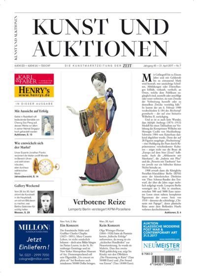 Bei Hassfurther gab die Frühlingsauktion Anlass zu bester Stimmung, als Rudolf Wackers „Der Maler. Selbstbildnis“ den Auktionsrekord für ein Gemälde des Österreichers deutlich nach oben setzte: 450.000 Euro waren geboten, als das auf 150.000 Euro geschätzte Werk von 1924 weitergereicht wurde und ein bemerkenswertes Ergebnis im Markt für Kunst der Neuen Sachlichkeit markierte. Auch die Kriegsansicht „Stellung im Gebirge“, die Herbert Boeckel 1916 in trügerisch harmonischer Weise komponierte, wurde mit 14.000 Euro Zuschlag deutlich über der Erwartung von 8000 Euro verkauft. Mit dem „Tiroler Dorfg / Auracher Kirchl“ und „Kitzbüheler Ski“ sind zwei Werke des sonst im Hause hoch gehandelten Alfons Walde nach der Auktion noch im Nachverkauf zu haben.