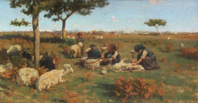 Bis die neue Weltsicht in Leben und Kunst ankam, musste allerdings noch viel Zeit vergehen. Doch die Zeitenwende war da. Landschaft, Tiere, Alltägliches, Dienstboten und simple Gebrauchsgegenstände erhalten Bildwürde. Ein neues Kunstzeitalter bricht an. Erst im 19. Jahrhundert ist die von Gleichberechtigung bestimmte Weltsicht Bild-Praxis. Von der Pracht und Wirkungsmacht der Hofkunst profitieren nun andere Protagonisten, wie die Auktion bei Ketterer am 18. Mai in München zeigt: Franz Defregger verleiht zwei kleinen Reisigsammlerinnen die Würde von Prinzessinnen (1872, Taxe 10.000 Euro), Stefano Bruzzi malt Hirten bei der Schafschur (1885, Taxe 18.000 Euro) und Friedrich Kallmorgen hält zwei Mädchen beim Wasserschöpfen am „Sommernachmittag“ (1893, Taxe 12.000 Euro) so feinsinnig fest, als wären es Adelstöchter.
