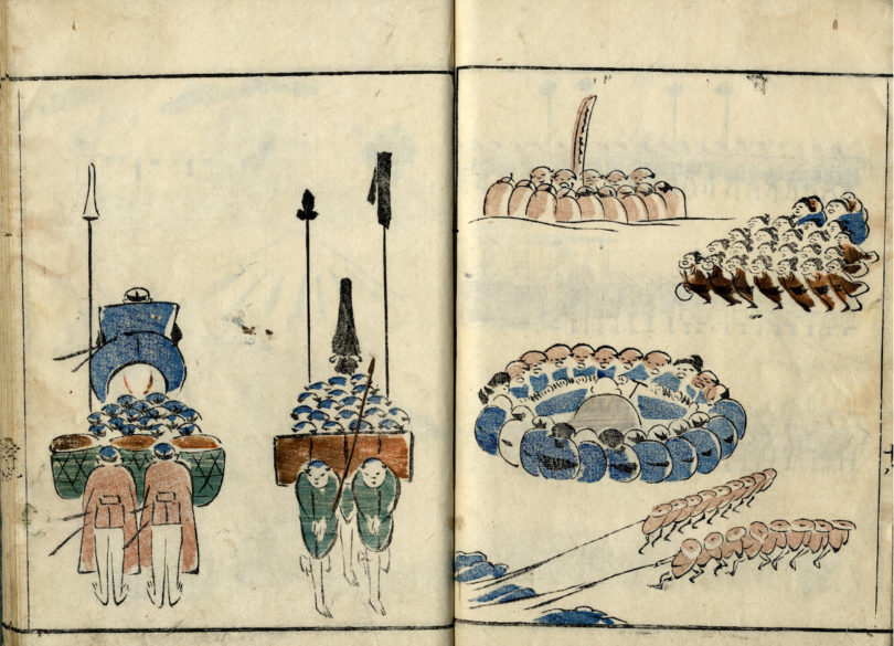 Spannend ist auch ein illustriertes Buch von Kitao Masayoshi, datiert auf 1813, das in erster Auflage 1799 erschien. Es trägt den Titel „Jinbutsu ryakuga shiki (Vereinfachte Zeichnungen von Menschen“). Die Illustrationen auf 30 Seiten wirken wie Schnappschüsse, indem sie Menschen in verschiedenen Konstellationen mit flüchtigen Pinselstrichen wiedergeben. Laut Julie Weissenberg-Déville inspirierte Masayoshi den Großmeister Hokusai zu seinen 15 Manga-Bänden mit Tausenden von Holzschnitten, die Mitte des 19. Jahrhunderts auch in der westlichen Welt bekannt wurden. Der Masayoshi-Band wird zur Taxe von 500 Euro aufgerufen.