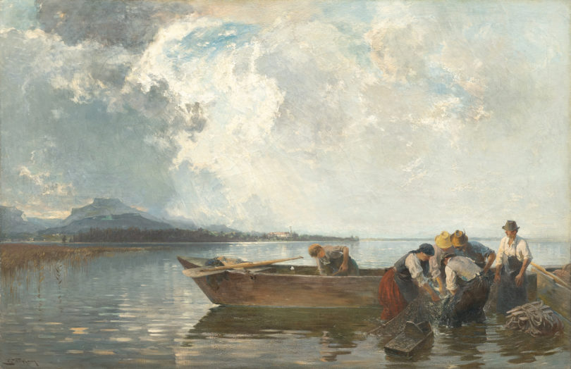 Majestätisch wirkt die vor dem Goldgrund thronende Madonna mit dem Jesuskind. Den Kopf leicht zu ihrem Sohn geneigt, greift sie zart dessen Arm. Puccio di Simone schuf das 90 mal 40 Zentimeter messende Gemälde im 14. Jahrhundert. Nun bietet es Karl & Faber am 14. November in München bei seiner Herbstauktion der alten Meister zum Schätzpreis von 40.000 bis 60.000 Euro an. Unter der Kunst des 19. Jahrhunderts sticht ein Gemälde von Josef Wopfner (1843–1927) heraus, der aufgrund seiner vielen Darstellungen des Chiemgaus auch „Chiemseemaler“ genannt. wurde. Erwartungsgemäß zeigt das Bild Fischer im flachen Ufergewässer des Chiemsees vor dem Hintergrund eines malerisch wolkenverhangene Himmels (Taxe 23.000 bis 28.000 Euro).