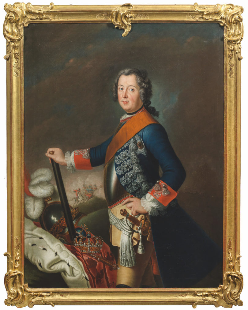 Auf verdiente Weise selbstbewusst stützt sich Friedrich II. in dem Gemälde, das der Berliner Hofmaler David Matthieu um 1743 schuf, auf seinen Feldherrenstab. Gerade erst feierte der Preußenkönig seine Siege im Ersten Schlesischen Krieg. Hinter ihm sieht man eine Gruppe von Husaren, die für ihn kämpfen. Schloss Ahlden versteigert in seiner Herbstauktion am 28./29. November das Porträt des hier noch jungen „Alten Fritz“ zum Schätzpreis von 135.000 Euro. Da Friedrich ab 1740, seinem Krönungsjahr, nicht mehr Modell saß, orientierte sich Matthieu wohl an einem Porträt des Hofmalers Antoine Pesne. Das Werk befindet sich noch im originalen Rokoko-Rahmen. Eine zweite Version des Gemäldes ist im Militärhistorischen Museum in Dresden zu finden.