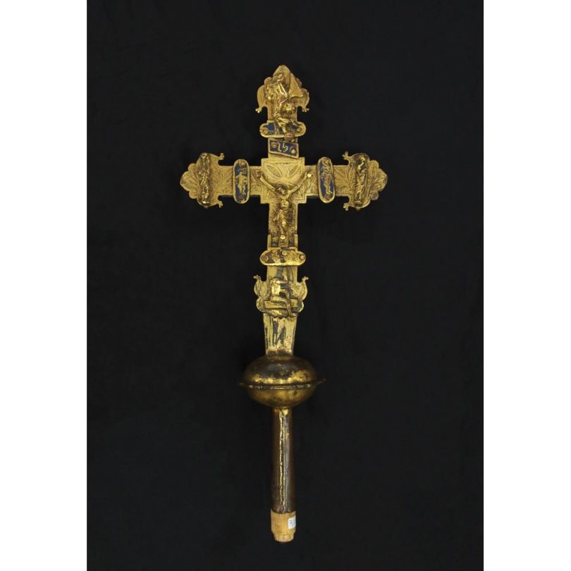 Heilig’s Blechle: Sakrale Kunstwerke der Epoche zwischen 1300 bis 1500 aus edlem Metall werden am 5. Dezember bei Dr. Eder in Köln aus verschiedenen Privatsammlungen versteigert. Ein Vortragekreuz aus vergoldetem Kupfer wurde um 1350 in Frankreich gefertigt. Es zeigt Christus, Maria und Johannes als Vollgussfiguren, die beiden Schächer Dismas und Gestas auf Emailplaketten. Das Kreuz gelangte aus dem Nachlass König Leopolds III. von Belgien über den Kunsthandel in eine Stuttgarter Sammlung und hat jetzt einen Limitpreis von 7500 Euro. Ein französisches Silberkreuz der Zeit um 1500 mit einem Lamm Gottes im Hochrelief und den Baronen Seydlitz-Kurzbach als Vorbesitzer soll mindestens 5000 Euro bringen.