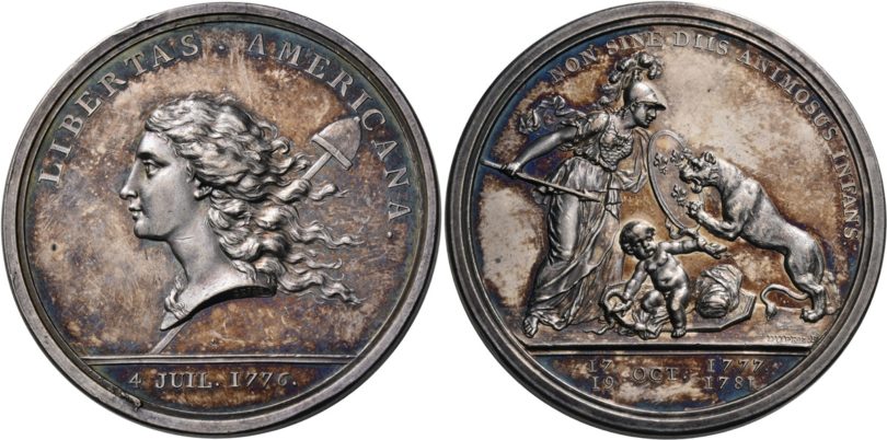Den Triumph einer blutjungen Nation zeigt die erste amerikanische Medaille überhaupt, ein ganz besonderes, extrem seltenes Stück aus dem Jahr 1783. Ein Exemplar ist am 21. November bei Nomos in Zürich auf mindestens 100.000 Franken geschätzt. Kein geringerer als Benjamin Franklin gab die Silbermedaille in Auftrag. Er war damals Botschafter in Frankreich und bedankte sich für die französische Unterstützung im amerikanischen Unabhängigkeitskrieg. Auf der Vorderseite ist die Personifikation der Freiheit mit flatterndem Haar dargestellt. Auf der Rückseite sieht man Herkules als Baby beim Erwürgen von zwei Schlangen – er symbolisiert die jungen Vereinigten Staaten – während Minerva ihn beschützt. Die Göttin steht für Frankreich, wie die Lilien auf ihrem Schild verraten, und wehrt die angreifende Löwin ab, Symbol für Britannien. Darüber der lateinische Spruch „Dem mutigen Kind halfen die Götter.“