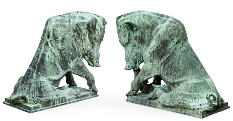 Carl Milles war ein schwedischer Exportschlager. Der Bildhauer (1875–1955) schuf in Europa und den USA öffentliche Bronzewerke in seinem monumentalen, oft auch pathetischen Naturalismus. Das in diesem Jahr 150. Geburtstag feiernde Auktionshaus Bukowskis bietet am 10./11. Dezember in Stockholm zwei lebensgroße Wildeber aus Bronze an, entstanden 1929 und auf umgerechnet 78.000 Euro taxiert. Avantgardistisch sind die Keiler nicht, aber in ihrer realistischen Ausdruckskraft ein kapitales Stück schwedischer Kunstgeschichte. Das gilt auch für einen Konsoltisch, der den gustavianischen Klassizismus prachtvoll repräsentiert. Einst war dieser im Besitz des Königshauses (Schätzpreis 7300 Euro).
