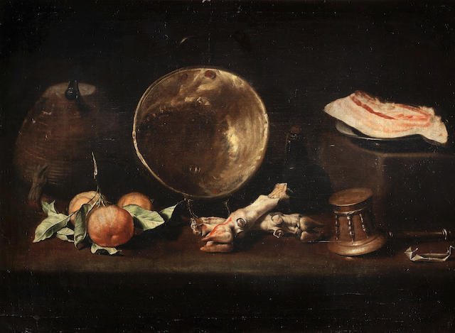 Einen dezenten vorweihnachtlichen Horrorschocker serviert Bonhams am 17. Dezember in London, wenn in der Altmeister-Auktion auch das eine oder andere Motiv mit Splattermovie-Anmutung zum Aufruf kommt: Die dem Sujet „David und Goliath“ innewohnende Dramatik hat ja viele Künstler inspiriert, doch so eiskalt wie der Florentiner Maler Jacopo Vignali (1592–1664) hat es kaum jemand auf die Leinwand gebracht. Mit erschreckend gleichgültigem Blick hebt der Hirtenjunge den Kopf des riesenhaften Kriegers aus dem dunklen Hintergrund hervor – so als sei ein Kampf auf Leben und Tod für ihn ein Sonntagsspaziergang. In diesem Bild verraten allein ein paar Blutspitzer auf der Stirn Goliaths und ein angedeuteter Messergriff in der Hand Davids, dass an dem gegriffenen Haupt einmal ein Leib hing. Das Gemälde, das Vignali um 1624 als einer der ersten carravaggesk im Chiaroscuro-Stil malte, offeriert Bonhams nun mit einer Taxe von 150.000 Pfund. Das die Zeit alles Irdischen begrenzt ist, mahnt auch ein Stillleben aus der „Schule von Sevilla“ (etwa 1630–1660) mit verbeultem Kupferkessel, abgeschnittenem Orangenzweig, Messer und Speck. Für Gruselgefühle sorgen hier vor allem die abgehackten Schweinsfüße, die mit blutigen Streifen verschmiert sind. Bonhams schätzt das Memento Mori aus dem „Siglo de Oro“ auf 50.000 Pfund.