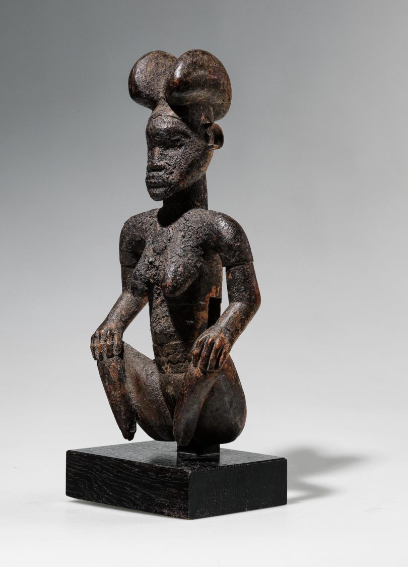„Form and Figure“ betitelt das Dorotheum seine Tribal-Art-Auktion am 15. Dezember in Wien. Das Toplos, auf 120.000 Euro geschätzt, ist das Covergirl des Katalogs: eine 33 Zentimeter große weibliche Skulptur der Teke oder der Bembe aus dem Kongo. Mit ihrem würdevollen, in sich ruhenden Ausdruck, den breiten Schultern und der Frisur mit den beiden dicken Haarknoten repräsentiert sie eine Frau von hohem Rang. Ihr Körper ist mit schmückenden Narben versehen, noch mehr aber fällt die krustige Patina auf, mit der sie bedeckt ist. Dass diesem Meisterwerk die Beine unterhalb der Knie fehlen, ist kein Makel, sondern unterstreicht die Geschlossenheit der Form. Der renommierte Schweizer Sammler Udo Horstmann trennt sich von diesem Stück und weiteren 27 Losen.