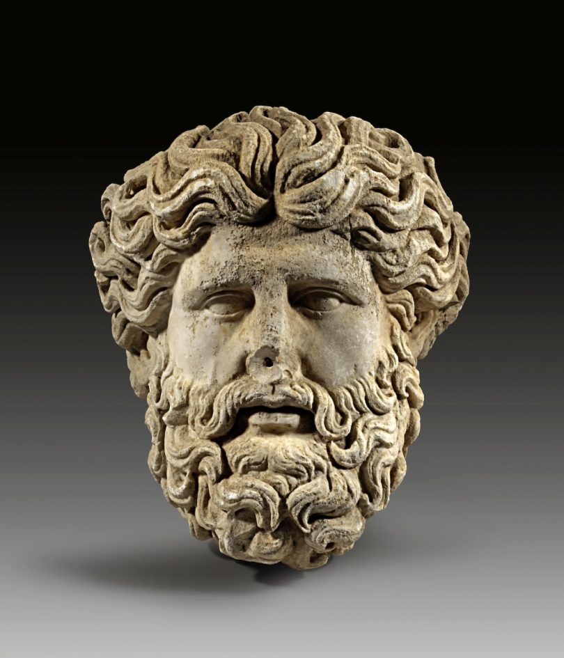 Das volle Kopfhaar strömt in wilden Locken nach hinten, wie von einem Windstoß getrieben. Der mächtige Vollbart ist in dichten Strähnen nach vorne gekämmt. Diese Kombination aus männlicher Wildheit und idealisiertem Gesicht spricht dafür, dass es sich bei dem beeindruckenden antiken Marmorkopf, den Gorny & Mosch am 16. Dezember in München versteigert, um die Darstellung einer klassischen Vatergottheit handelt. Denkbar wären Zeus oder Poseidon, wobei die Tendenz im Auktionshaus eher in Richtung des Meeresgottes geht. In der Auktion „Kunst der Antike, Afrika, Asiatica, Präkolumbische Kunst“ ist der 38 Zentimeter große Kopf, der im zweiten Viertel des zweiten Jahrhunderts entstand, der Titelstar bei den römischen Skulpturen (Taxe 30.000 Euro).