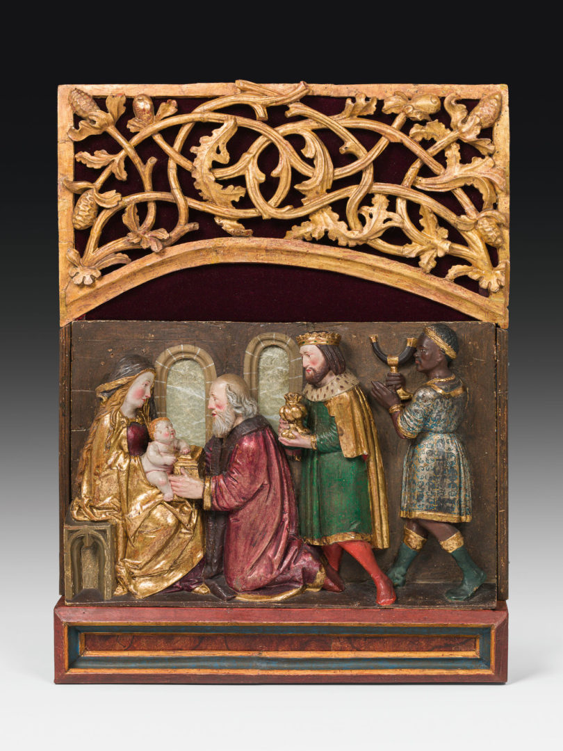 Vor dem Jesuskind kniet ein greiser König, der ihm sein Geschenk darreicht. Dahinter warten noch ein Regent im reifen Mannesalter und ein jüngerer, dunkelhäutiger Monarch mit ihren Gaben. Der Tiroler Bildhauer, der um 1520 die Anbetung der Heiligen drei Könige als Relief aus Zirbenholz schnitzte, folgte also der Bildtradition, nach der die Würdenträger drei Lebensalter und drei Kontinente vertreten – wobei die asiatischen Gesichtszüge des mittleren nicht ausgeprägt sind. Gemeinsam sind ihnen die prachtvollen Gewänder, die sich mit originaler Fassung und Vergoldung in kostbarer Stofflichkeit zeigen. Das Wiener Auktionshaus Im Kinsky versteigert an seinen Auktionstagen vom 15. bis 17. Dezember dieses besinnliche Kunstwerk und erwartet dafür einen Zuschlag um 8000 Euro.