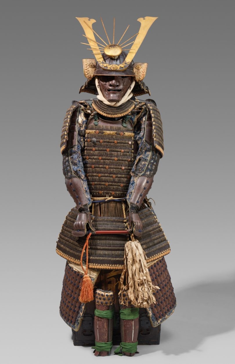 Nur Feiglinge verstecken sich auf dem Schlachtfeld. Dem unbekannten Träger des Helmschmucks vom Typ Hirschkäfer aus vergoldetem Kupfer, ergänzt um eine golden lackierte hölzerne Sonne mit weit ausladenden Sonnenstrahlen, ging es offensichtlich darum, in der Menge der Kämpfer aufzufallen und Persönlichkeit zu zeigen. Der Helm (kabuto) wurde aus sechzehn Platten gefertigt und ist Teil einer Großrüstung (yoroi) aus dem 17. Jahrhundert, wie sie berittene Bogenschützen trugen. Unter insgesamt neun japanischen Rüstungen, die Lempertz im Rahmen seiner Asiatika-Versteigerung am 15. und 16. Dezember in Köln anbietet, ist diese mit einer Taxe von 35.000 Euro eindeutig das Toplos. Der Nackenschutz (shikoro) ist durch Haruta Mitsusada signiert.