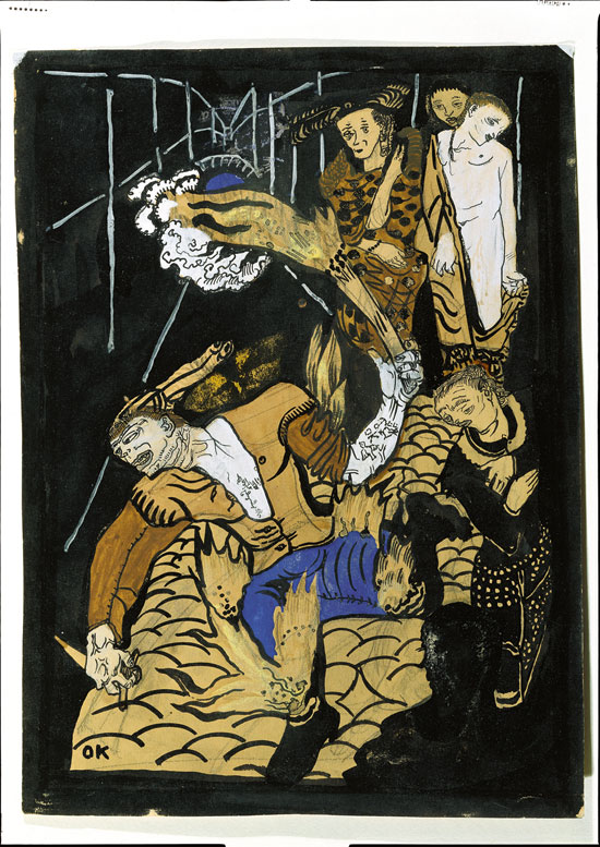 „Enfant terrible“ nannten den jungen Maler-Heißsporn Oskar Kokoschka schon früh seine Kritiker. Wenn eine Geliebte ihn abwies, lief er im Geiste Amok. Daraus erklärt sich auch die tödliche Aggression in diesem Bild: Der Künstler als lodernder Berserker, die Verderbnis bringende, brennende Fackel in der Linken, den Dolch in der Rechten, stürmt er eine Straße hinunter. In „Der Amokläufer“ von 1909 verweisen die Tattoo-Monogramme OK und L. L. am Unterarm an die gerade zerbrochene Beziehung zwischen Kokoscha und der Malerin Lilith Lang. Das Wiener Auktionshaus Hassfurther bringt das Aquarell am 28. Januar in seiner Kunstauktion mit einer Taxe von 250.000 bis 500.000 Euro zum Aufruf.