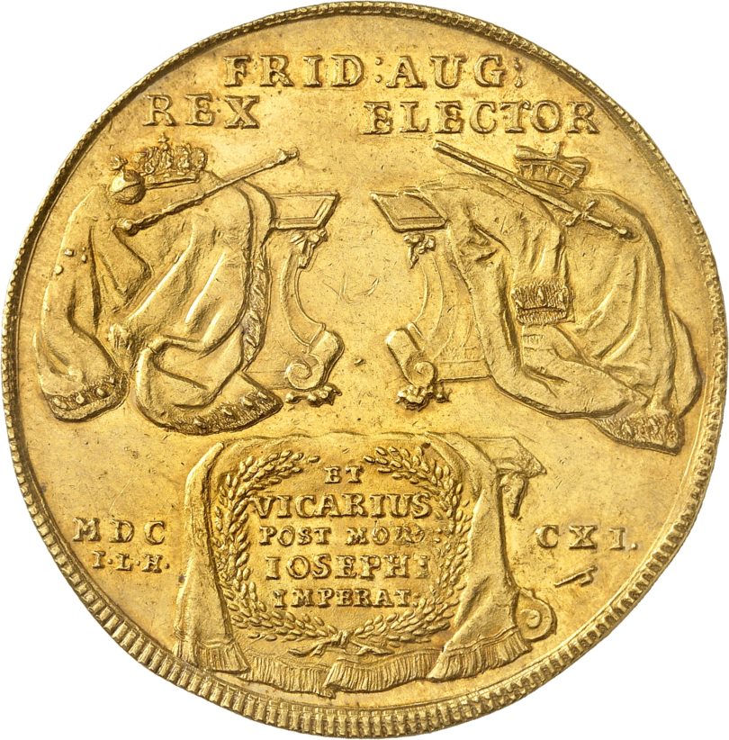 Die stattliche Taxe von 100.000 Euro oder mehr bringen gleich sieben Spitzenstücke in der Versteigerung mit Münzen und Medaillen des Auktionshaus Künker am 28. Januar in Osnabrück mit. Auf 150.000 Euro geschätzt ist ein sehr seltenes sächsisches Zehndukatenstück mit dem Bild Augusts des Starken zu Pferde, welches 1711 anlässlich der Ausübung des Reichsvikariats nach dem Tode des Kaiser Joseph I. mit den Stempeln des Reichstalers geprägt worden war. August nutzte die Münze zur dezenten Propaganda, indem sie seinen umstrittenen Anspruch auf den polnischen Thron bildlich betonte: Auf dem Revers sieht man rechts den Kurhut und das Kurschwert als Insignien des sächsischen Kurfürsten und links die polnische Königskrone mit Szepter und Reichsapfel.