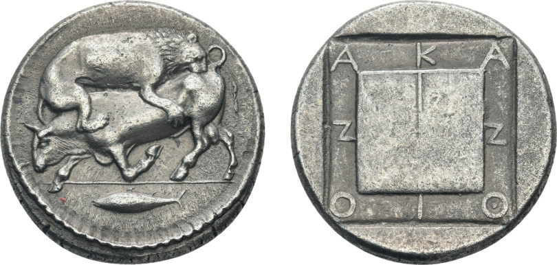 Der Torso einer hübschen, kleinen Buddha-Statue aus Indien (Gupta-Dynastie, 5. Jh. n. Chr.) ist mit einem Schätzpreis von 55.000 Euro das Toplos bei den Auktionen mit Antiken, Münzen und Medaillen am 10. bis 12. Februar bei Gerhard Hirsch Nachfolger in München. Das Objekt besticht durch die kunstvolle Ausarbeitung des Gewandes und die Ausgewogenheit der Körperhaltung. Mit rund 1800 Losen liegt jedoch rein zahlenmäßig das Hauptgewicht wie gewohnt bei den Münzen aus Antike, Mittelalter und Neuzeit. Hochdramatisch wirkt die Darstellung auf einem hervorragend erhaltenen Tetradrachmon aus dem nordgriechischen Akanthos (Taxe 6000 Euro). Das in der antiken Welt weit verbreitete Motiv des Löwen, der einen Stier reißt, ist typisch für die Tetradrachmenprägungen der an der Ostküste der Chalkidike gelegenen Griechenstadt und wurde dort im Laufe des 5. Jh. v. Chr. immer wieder abgewandelt. Im Gegensatz zu anderen, in ihrer expressiven Bildsprache geradezu barock wirkenden Varianten dieses Münztyps wirkt die hier angebotene Münze durch die Klarheit der Formen.