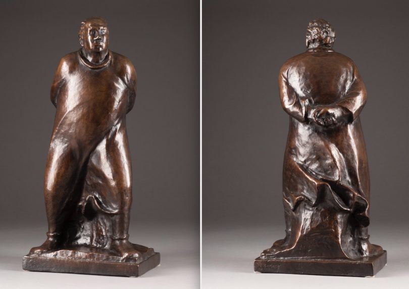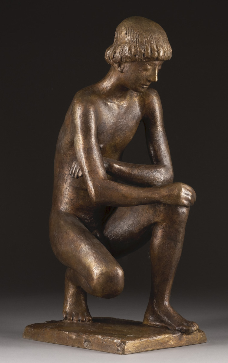 Mit der aufkommenden Moderne verloren das Personendenkmal auf der einen und die mythologische Figur auf der anderen Seite ihre Aktualität. Die Bildhauer befassten sich, wenn sie nicht zur Abstraktion neigten, ganz einfach mit der menschlichen Gestalt – ohne historische, allegorische oder anekdotische Bedeutung. Jetzt suchten sie vermehrt nach bewegten oder statischen Haltungen des – meist unbekleideten – Körpers. Zwei solcher bronzenen Aktfiguren von Gerhard Marcks (1889 – 1981) – ein „Hockender mit verschränkten Händen“ und „Hockender Raimund“ – ergänzen das Skulpturen-Angebot der Auktion bei Hargesheimer (Limit je 12.000 Euro). Auf den ersten Blick könnte man meinen, Marcks habe nach demselben Modell gearbeitet, aber die unterschiedlichen Gesichtszüge und die Datierungen, 1968 und 1973, sprechen dagegen.
