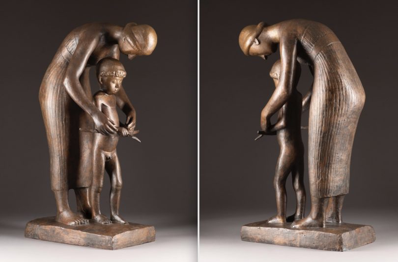 Offenbar unter dem frischen Eindruck Griechenlands hat er 1930 doch noch einmal eine mythologische Figurengruppe, nämlich „Venus und Amor“, mit mehreren Entwürfen vorbereitet. Sie wurde 1952 in nur drei Exemplaren in Bronze gegossen, versehen mit Künstlersignet und Stempel „Guss Barth Berlin“. Das erste Exemplar besitzt die Gerhard-Marcks-Stiftung in Bremen, das zweite die Stadtverwaltung in Herne. Der dritte Guss, bisher wie die anderen Bronzen der Auktion in einer Privatsammlung, kommt bei 30.000 Euro zum Aufruf. Marcks hat diese besonders reizvollen Gestalten der Mythologie gewählt, die als Gruppe weniger in der Antike als vielmehr seit der Neuzeit – und dann bis weit in das 19. Jahrhundert hinein – die Bildhauer zu allerlei Genredarstellungen angeregt haben. Gerhard Marcks zeigt einen durchaus menschlichen Augenblick, in dem Mutter Venus ihrem Sohn den Umgang mit Pfeil und Bogen erklärt (meist eher die Aufgabe eines Vaters).