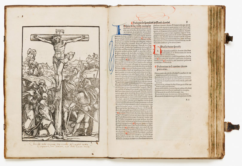 Mehr als hundert Jahre vor Erscheinung des Navigationsbuchs war Albrecht Dürer auf Venedigreise und überließ den Künstlern seiner Werkstatt –Hans Schäufelein, Hans Baldung Grien und Hans Süß von Kulmbach – im Jahr 1507 die eigenständige Produktion eines Passionstraktats. Auf 77 Holzschnitten werden darin die letzten Stationen des Lebens Jesu Christi dargestellt. Sie machen Ulrich Pinders „Speculum passionis domini nostri Ihesu christi“ zu einer begehrten Kostbarkeit mit einem Schätzpreis von 18.000 Euro.