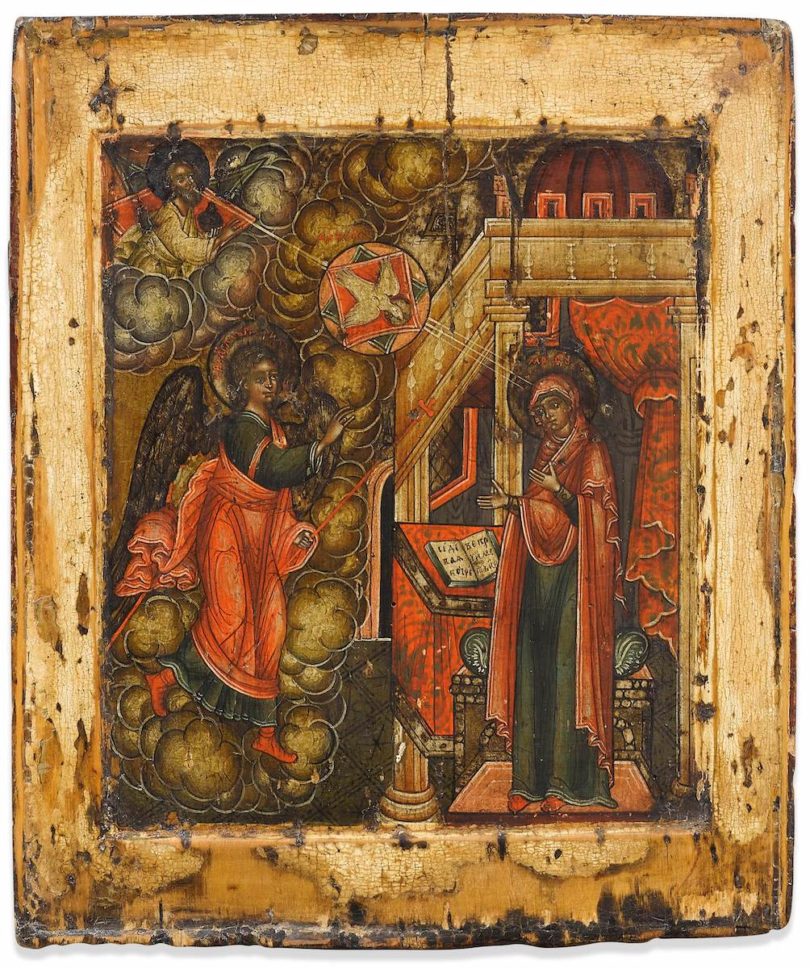 Dass im Dezember 2020 bei Koller in Zürich eine um 1700 entstandene „Verkündigung“ – bar ihrer ehemaligen silbergetriebenen Basmastreifen – für beträchtliche 8000 Franken zugeschlagen wurde, mag für die allmählich wieder ansteigenden Preise „älterer“ Hausikonen russischer Provenienz sprechen. Dargestellt ist der Augenblick der „Inkarnation“ des Gottessohnes. Maria kauert aber keineswegs als „Magd des Herrn“ vor dem heranstürmenden Gottesboten, wie man das von vielen anderen Ikonen kennt. Maria blickt gefasst auf den Engel, der sich ihr aus der Höhe nähert.