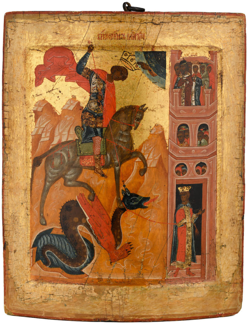 Eine Ikone aus einer Privatsammlung (Berlin, Moskau), die im 16. Jahrhundert in Russland (Cholmogory) geschaffen wurde, zeigt – anders als etwa postbyzantinische Werke des 15./16. Jahrhunderts – keinen kraftvoll heranpreschenden Ritter, der dem fauchenden Untier mit aller Kraft die Lanze in den Rachen stößt. Die Bedrohung richtet sich hier vielmehr gegen die zum Menschenopfer für die Stadt erwählte Prinzessin. Und es genügt Georg offensichtlich ein leicht, aber sicher geführter, „ermahnender“ Stoß, um dem Untier alle Kraft zu rauben: Der Vollzug des göttlichen Willens, so versichert diese Ikone, fordert keine Anstrengung.