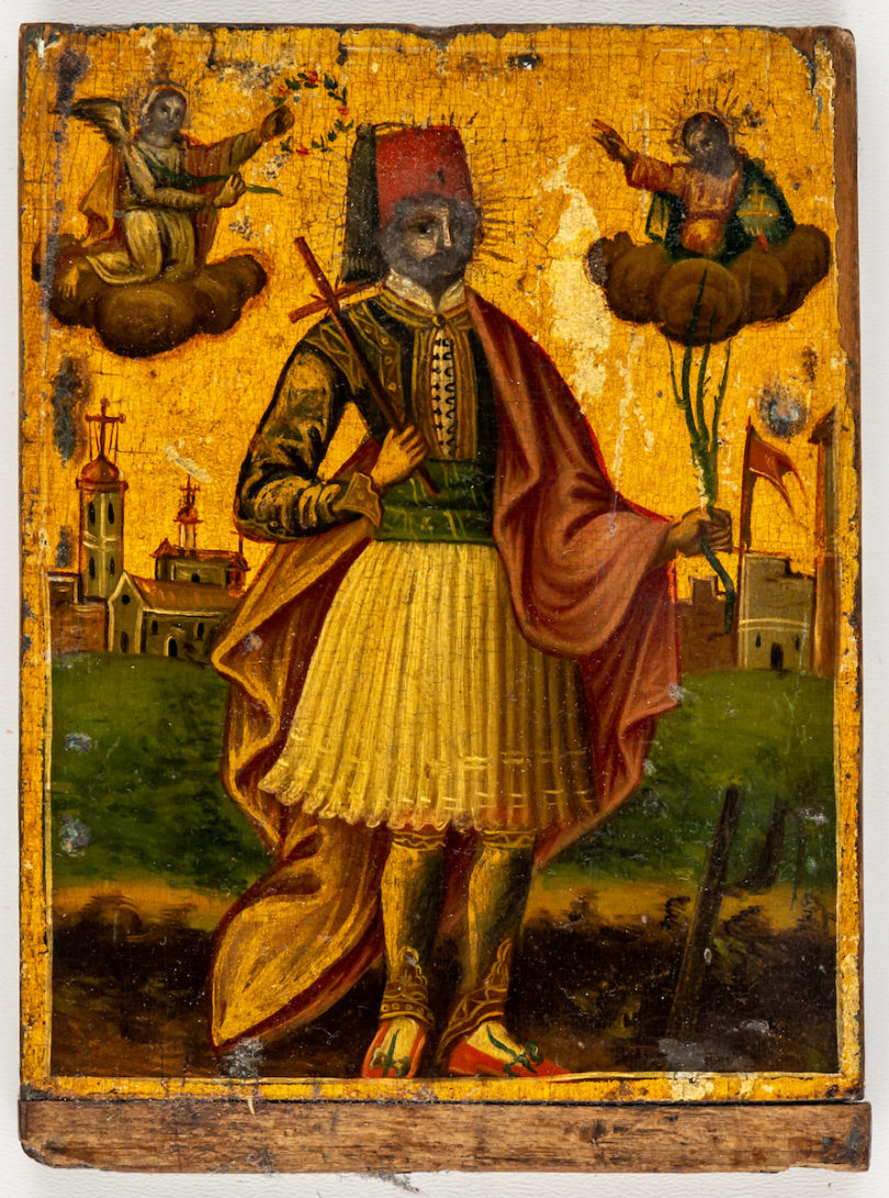 Die Kleidung des „Neomärtyrers“ Georg (von Joannina) zeigt in der selbstverständlichen Kombination der hellenischen „Fustanda“ mit dem türkischen Fez, wie weit nach Jahrhunderten osmanischer Herrschaft die kulturelle Assimilation der Griechischstämmigen fortgeschritten war. Gegen die Verheiratung des (vermeintlich?) sunnitisch-islamischen Janitscharen Hasan (alias Georgios) mit einem Christenmädchen hatte zunächst niemand etwas einzuwenden gehabt. Als Hasan/Georgios dann aber 1838 das gemeinsame Kind zur Taufe brachte und darauf bestand, zu keiner Zeit Muslim gewesen zu sein, wurde er von der osmanischen Obrigkeit zum Tod durch den Strang verurteilt und hingerichtet. Noch im selben Jahr wurde er auf ein Heilungswunder hin – der Legende nach bewirkt durch Auflegung einer der Leiche noch am Galgen abgezogenen Socke – vom Synod des ökumenischen Patriarchats als (Neo-)Märtyrer heiliggesprochen.