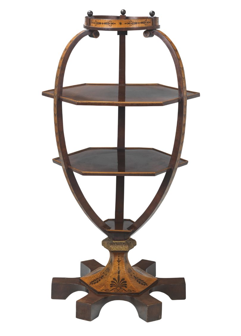 Nur die Epoche allein ist im gespaltenen Markt derzeit kein Kriterium für hohe Begeisterung. Die Versteigerung einer Kollektion von Möbeln aus dem Besitz des Pariser Top-Händlers Benjamin Steinitz bei Sotheby’s hat im Juli 2020 erneut gezeigt: Connaisseurs reizt der Esprit eines Stücks mehr als museale Gediegenheit. Von 15.000 auf 60.000 Euro kletterte beispielsweise der Preis eines Seepferdchen-Stuhls aus dem frühen 19. Jahrhundert, der die italienischen Grotto-Möbel auf seine Weise interpretiert. Diesen Trend zum Exzeptionellen berührte im Wiener Dorotheum eine Wiener Empire-Etagere von circa 1810, die wie ein Objekt aus einer Fantasiewelt daherkommt. Wie ein Blütenkelch umschließen geschwungene Holme die sechseckigen Ablageflächen und balancieren über einem kurzen, schlanken Schaft. Das Objekt erzielte Anfang November 16.000 Euro. Das Fazit der letzten zwölf Monate: Da geht doch was!