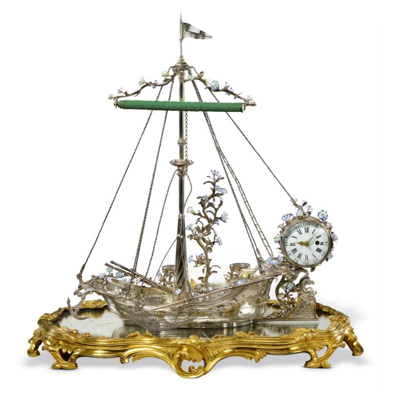 Zu den ungewöhnlichen Stücken, für die hohe sechsstellige Erlöse erhofft werden, zählen ein Stundenglas und ein Schreibzeug. Das Écritoire schuf François-Thomas Germain, „Orfèvre et Sculpteur du Roi“, 1752 für Jean-Baptiste de Machault d’Arnouville, der dank der Protektion von Madame de Pompadour, einer Vorgängerin der Madame Hainault, Siegelbewahrer des König wurde. Es ist ein silbernes Schiff auf einem goldgefassten Bronzesockel mit einem Spiegel als See, aufgetakelt mit eingerolltem Segel und einer Uhr über dem Steuerruder am Heck. 700.000 Euro soll diese eigenwillige Schreibtischzier bringen.