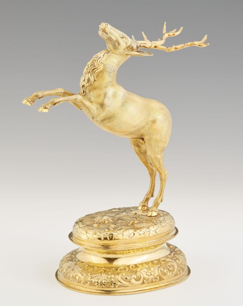 Mit englischem Silber hatte de Leye nichts im Sinn: „Das ist ganz einfach zu erklären. In Kontinentaleuropa wurde Silberzeug oft eingeschmolzen, um monetäre Schwierigkeiten zu bewältigen. Schöne alte Stücke sind daher relativ selten, insbesondere französisches Silber, das am seltensten und teuersten ist. Die Engländer dagegen verfügten über die wichtigsten Silbervorkommen, machten damit gute Geschäfte. Damals war, anders als heute, das Metall teuer, nicht die Arbeit. Deshalb ist englisches Silber im Überfluss vorhanden … Nichts ist wirklich selten, man findet alles, was man will, während man bei kontinentalem Silber auch mit viel Geld nicht unbedingt das Gesuchte findet.“ Das kann der springende Hirsch aus vergoldetem Silber als Trinkspiel sein, um 1640 von dem Zürcher Goldschmied Hans Caspar Gyger gefertigt. Jetzt für 250.000 Euro angeboten. Oder ein Tischkreuz von 1675 von Guillaume II Loir für 50.000 Euro.