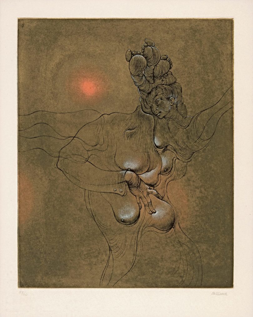 Irene Lehr präsentiert in ihrer Auktion am 30. Oktober in Berlin eine eindrucksvolle farbige Aquatintaradierung von Bellmer aus dem Jahr 1964, „Le bon sens“, in der man all diese Bezüge und noch viel mehr entdecken kann (Taxe 800 Euro). Vorlage war eine Zeichnung von 1961, heute im Besitz des Centre Pompidou.