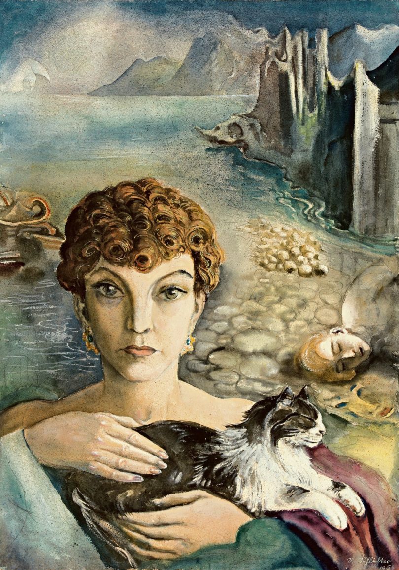 Eine andere Art von Obsession spricht aus den mesmerisierenden Bildnissen, die Rudolf Schlichter von seiner Frau Speedy anfertigte, sehr häufig mit einer Katze, wie sie auch schon Manet als erotisches Symbol benutzte. In der Gouache mit Aquarell „Speedy mit Katze (Melancholie)“, immerhin 79,2 mal 56 Zentimeter groß, variiert Schlichter 1954, kurz vor seinem Tod, ein zwei Jahre früher entstandenes Ölbild. 10.000 Euro werden dafür mindestens erwartet. Schlichters masochistische Hörigkeit Speedy gegenüber und seinen Knöpfstiefelfetischismus nahm sein Freund George Grosz bekanntlich in mehreren Zeichnungen auf die Schippe, obwohl Grosz selbst – wie unter anderem in seinen Briefen deutlich zum Ausdruck kommt – gewisse Eigenheiten sexueller beziehungsweise erotischer Natur pflegte.