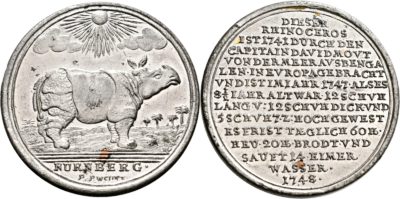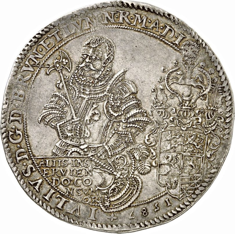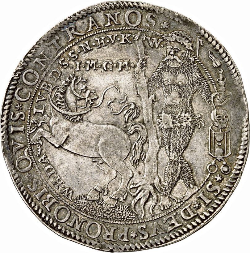 Aus dem Herzogtum Braunschweig-Wolfenbüttel stammen auch die beiden auffälligsten Silberstücke: ein doppelter und ein anderthalbfacher Reichstaler (Taxen 10.000 und 12.500 Euro). Auf dem Avers der bildgleichen Münzen, die beidseitig wie kaum eine andere Renaissanceprägung mit Bildmotiven, heraldischen Zeichen, sonstigen Symbolen und Sinnsprüchen überladen sind, sieht man nahezu frontal das geharnischte Hüftbild des Herzogs Julius (1568 – 1589) mit geschulterter Streitaxt und rechts neben ihm im Kleinformat das herzogliche Wappen, für das auf dem Revers, wohin es eigentlich gehört hätte, kein Platz mehr geblieben war. Dort begegnet man bildfüllend gleich zweien der für die welfischen Herzogtümer charakteristischen, gewöhnlich einzeln abgebildeten Sinnbilder: dem springenden Sachsenross (auch Niedersachsen- oder Welfenross) und einem Wilden Mann mit einem ausgerissenen Baum in der rechten Faust, der nicht – wie üblich – frontal in der Bildmitte steht, sondern vom rechten Bildrand zur Bildmitte schreitet. In der Linken hält er einen Leuchter mit einer brennenden Kerze, darunter sind ein Totenschädel, ein Stundenglas und eine Brille abgebildet, weshalb diese Münzen als „Brillentaler“ bezeichnet werden.