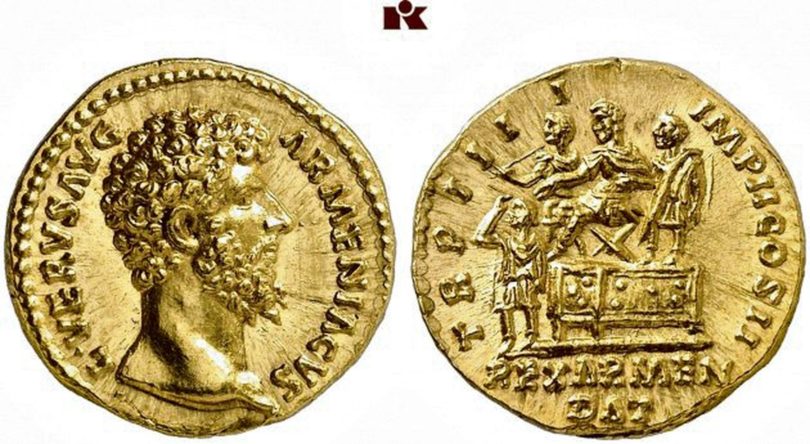 Am 4. April geht es weiter mit „Münzen der antiken Welt“ (Auktion 365). Am Anfang steht eine Auswahl griechischer Münzen, deren teuerstes Stück ein goldener Doppelstater Alexanders des Großen ist (Taxe 20.000 Euro). Bei den Römern dominieren die kaiserzeitlichen Prägungen, unter denen ein mit 15.000 Euro taxierter Aureus des Lucius Verus (161 – 169 n. Chr.) besondere Erwähnung verdient. Die mehrfigurige Szene auf dem Revers zeigt einen realen historischen Vorgang: die Einsetzung des Sohaemus als König von Armenien durch Lucius Verus im Jahr 162 oder 163 n. Chr. Vorausgegangen waren Kämpfe zwischen Rom und den Parthern um die Herrschaft über Armenien. 144 n. Chr. war Sohaemus schon einmal von den Römern unter Antoninus Pius als König eingesetzt worden, hatte dann aber vorübergehend den Thron räumen müssen. Gegenüber dem lebensnahen, vollendet ausgeführten Kaiserporträt auf dem Avers fällt das Reversbild – wie so oft auf römischen Münzen – stilistisch stark ab.