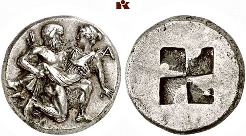 Am Ende der Reihe steht die Auktion 367 mit griechischen und römischen Münzen aller Epochen. Unter dem Titel „Griechische Münzen in schönen Erhaltungen – Die Sammlung Dr. Guy Sylvain Paul Bastin“ findet man zunächst griechische Prägungen von hoher Qualität. Mit 2000 Euro taxiert ist ein Stater von der thrakischen Insel Thasos (Abb. S. 12), dessen Avers einen Satyr im Knielaufschema zeigt, der lüstern eine keinen erkennbaren Widerstand zeigende Bacchantin davonträgt (kaum anzunehmen, dass von ihm zuvor korrekt eine Einverständniserklärung eingeholt wurde …). Ein zweites, nicht ganz so gut erhaltenes Exemplar desselben Typs ist mit 500 Euro taxiert. Es folgt eine kleinere, auch Prägungen der Kaiserzeit umfassende Kollektion römischer Münzen aus derselben Sammlung.