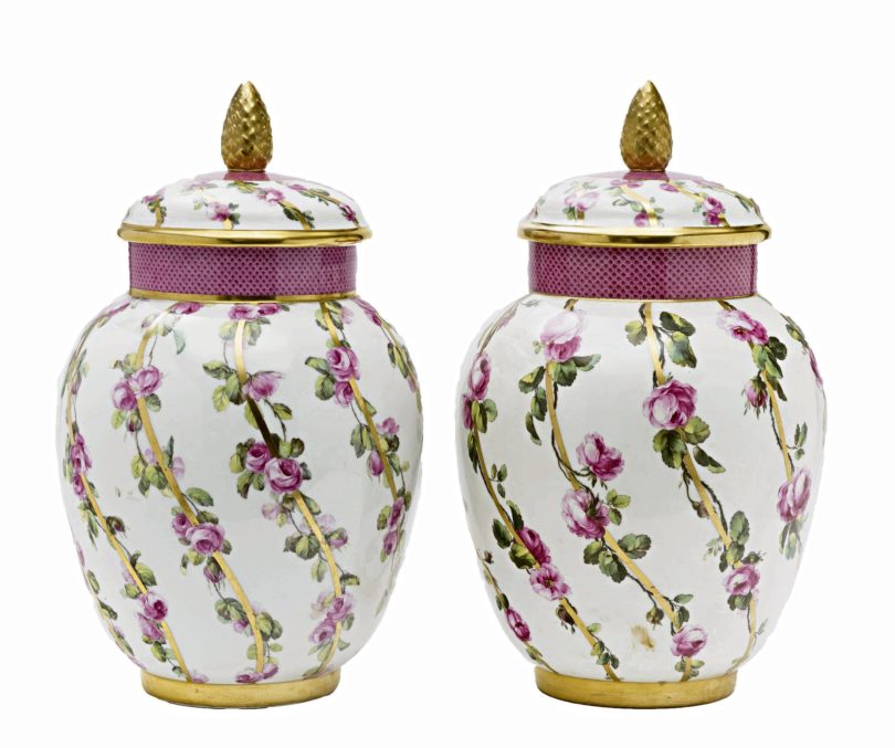 Zwei große Vasen, sogenannte Apothekerbüchsen, sind ebenfalls vom frühen Klassizismus beeinflusst. Der Dekor mit den über den Vasenkörper gezogenen Goldstäben, um die sich farbige Rosenfestons winden, geht in ein purpurfarbenes Schuppenmuster über. Als Deckelknauf dient ein prägnanter vergoldete Pinienzapfen (Taxe 1500 Euro).