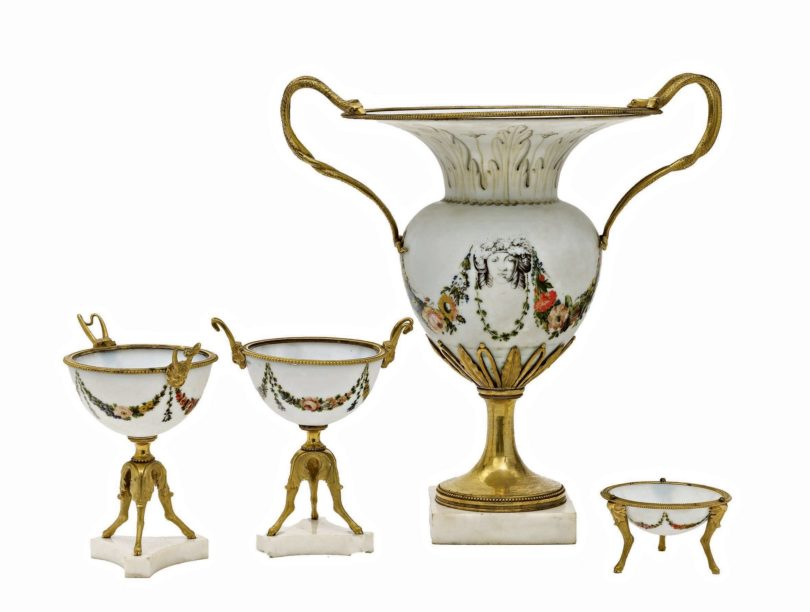 Erst bei der zweiten Durchsicht der Objekte durch das Neumeister-Team stellte sich heraus, dass knapp zwanzig fragile Gefäße aus Flussglas mit filigranen vergoldeten Bronzefassungen für die Kunstgeschichte einen ganz besonderen Schatz darstellen – und so werden die Objekte sicher schon im Vorfeld der Versteigerung große Beachtung finden. Sie wurden ab 1794 von Werner & Mieth in Berlin gefertigt und mit größtem Erfolg verkauft. Auf zwei Lose verteilt, sind sie mit 5000 und 7000 Euro – sehr vorsichtig – taxiert.