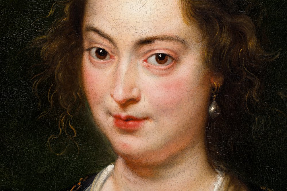 Danach dürfte, wenn man das Datum des ersten Verkaufs 1626 / 27 berücksichtigt, eigentlich nur Isabella Brant für das „Porträt einer Dame“ infrage kommen. Zur weiteren Enthüllung ihres Inkognitos bieten sich Vergleiche mit überlieferten Bildnissen seiner ersten Frau an. Das berühmteste entstammt Rubens’ „Selbstporträt mit Isabella Brant in der Geißblattlaube“ von 1609, auf dem der Maler ihr Antlitz und den aus dem Bild gerichteten Blick gleichermaßen leicht aus der Frontalität gerückt hat. Übereinstimmend mit dem „Porträt einer Dame“ zeigen sich – nicht nur auf dem Doppelporträt – Isabellas ein wenig schräg gestellte braune (?) Augen unter gebogenen Brauen, der gerade Nasenrücken und die geschwungenen Lippen. Allerdings ist das Gesicht, aus dem uns die Lady nach 400 Jahren so frisch anschaut, ein wenig schmaler, vielleicht auch nicht mehr ganz so blutjung, was der von Desa Unicum vorgeschlagenen Datierung des Gemäldes um 1620 / 25 entspräche. Isabella Brant ist 1626 gestorben. Übrigens hat auch der Rubens nahestehende Antonis van Dyck 1621 Isabella porträtiert und dieselben Merkmale ihrer Physiognomie herausgestellt.