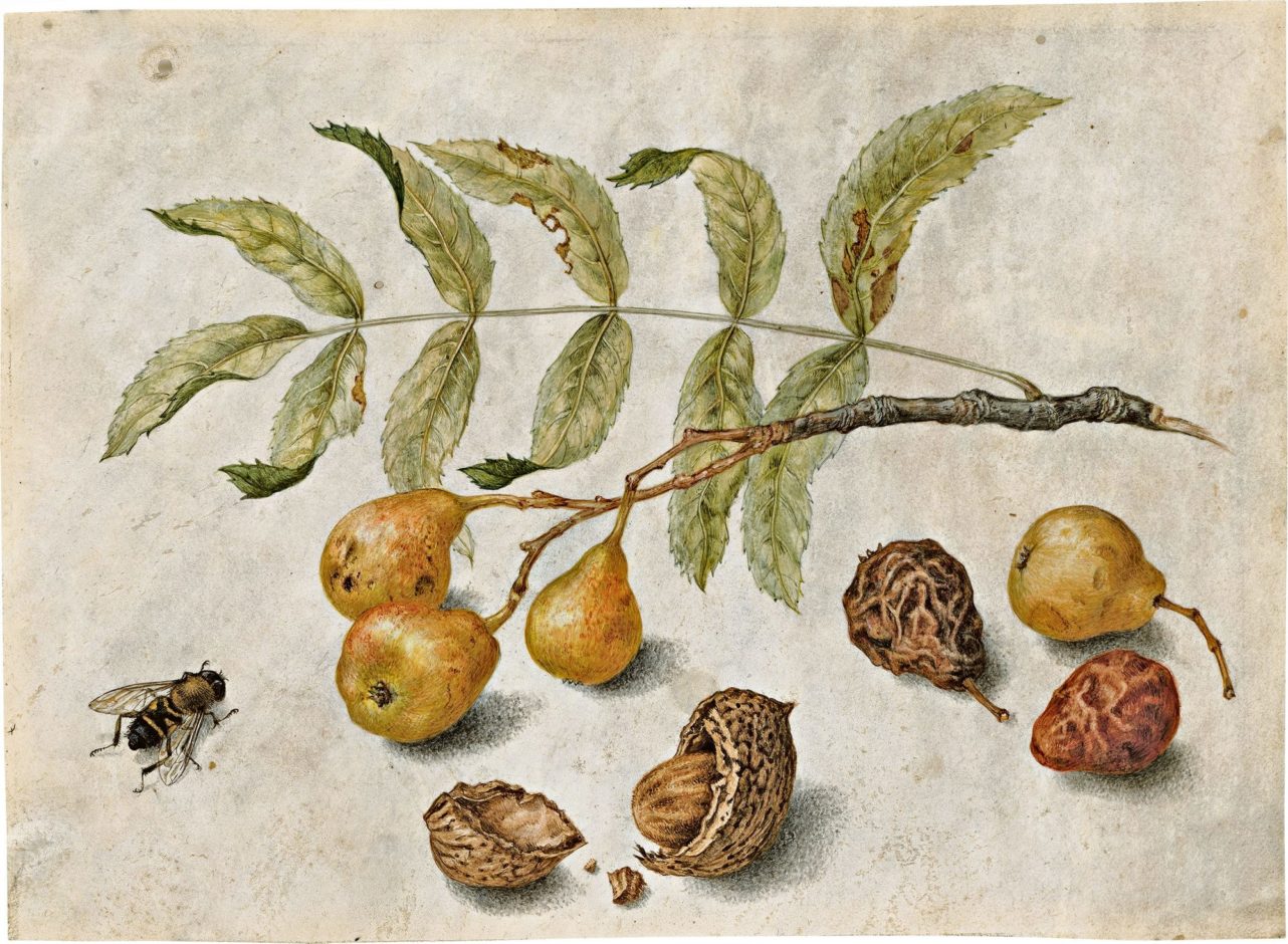Mit der Verlagerung der Themenschwerpunkte fiel auch die Hinwendung zu Tempera- und Gouache-Arbeiten zusammen, die sie bevorzugt auf Pergament ausführte. Ein besonders qualitätvolles Beispiel kann das Haus im Kontext des Sonder-Katalogs „Delikatessen“ anbieten. Das kleine Pergament zeigt eines der gesuchten botanischen „Stillleben mit Birnenzweig, gedörrten Birnen, einer Mandel in Schale und einer Stubenfliege“. Angedacht sind dafür 60.000 Euro – eine wahrhaft maßvolle Taxe für eine Künstlerin, die dem Vernehmen nach zu Lebzeiten für ihre Werke jeden gewünschten Preis aufrufen konnte!