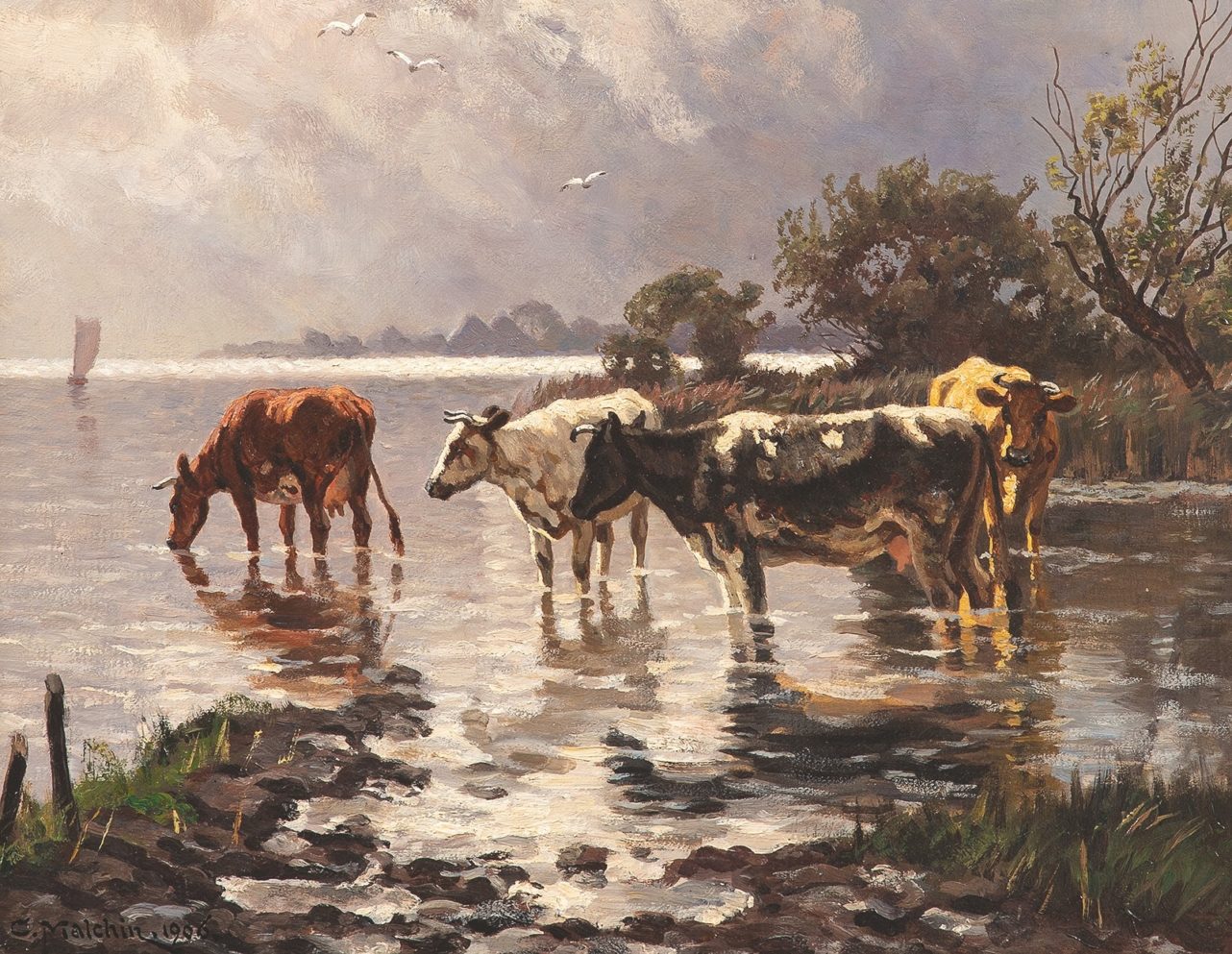 Ein eigens für die Versteigerung entworfenes Plakat, gestaltet von einem dafür beauftragten Künstler, das gibt es wohl nur beim Auktionshaus Ahrenshoop. Damit wird die Tradition des Ortes als ehemalige Künstlerkolonie lebendig gehalten. Dieses Jahr wurde es von Christopher Lehmpfuhl gestaltet, der sich in seiner Lithografie von fünf Steinen für das Thema „Gegenlicht“ entschieden hat. Er widmet sich damit einem Phänomen, das auch viele in der Auktion angebotenen Arbeiten auf faszinierend unterschiedliche Weise aufgreifen. Bei der für eine Taxe von 9000 bis 12.000 Euro angebotenen „Schäferin am Bodden“, einem mit 62 mal 93 cm wohnzimmertauglichen Ölbild von Louis Douzette, das um 1916 entstand, strahlt der noch mondhelle Himmel kalt über die Rücken einer Schafherde.