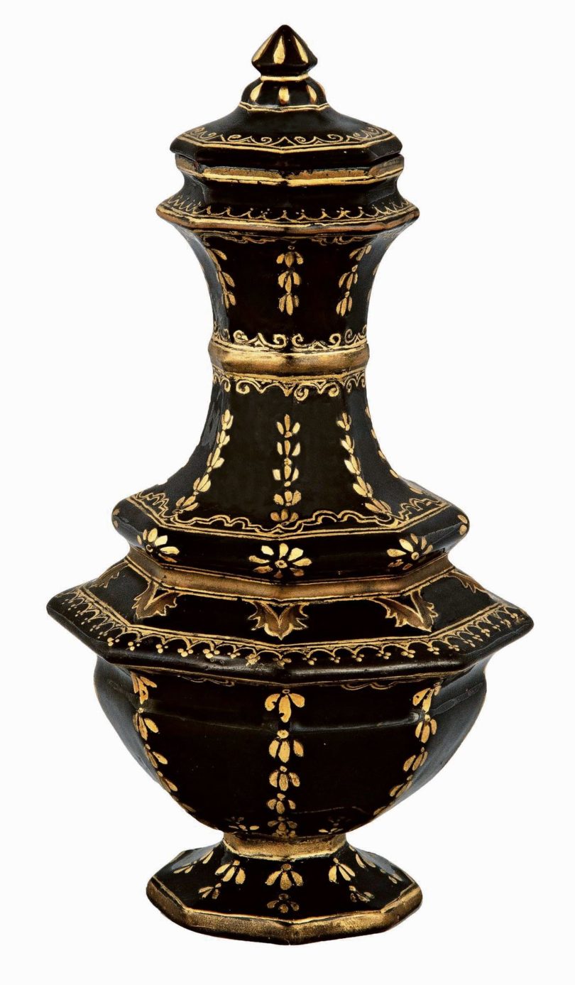 Eine zentrale Rolle für die rasche künstlerische Entwicklung der Manufaktur spielte Johann Jacob Irminger. Seit 1687 Hofjuwelier in Dresden, holte ihn Böttger nach Meissen, wo er Kannen, Teedosen, Schalen und andere Formen entwarf, die in Böttgersteinzeug und auch im weißen Porzellan ausgeführt wurden. Charakteristisch für ihn sind Akanthusdekorationen und Gesichtsmasken (Maskaronen). Ein Meisterstück ist eine Teekanne mit einer Maske unter dem Ausguss und einer Silbermontierung, zu der auch eine Kette zur Sicherung des Deckels gehört (Taxe 45.000 Euro). Besonders schön zeugt eine Kanne in der „türkischen Form“ (Taxe 24.000 Euro) von Irmingers Erfindungsgabe. Ihr Deckel ähnelt einem Turban, der Korpus entfernt an ein rundes Zelt. Eine Teedose wurde bei Irminger zur raffiniert ein- und ausschwellenden Skulptur. Auf der schwarzen Glasur sorgt eine Kaltgoldbemalung für zusätzliche Eleganz, wofür man sich 25.000 Euro erwartet. Nicht minder effektvoll ist eine sechseckige Teedose, deren rote Flächen mit asiatisch anmutenden Goldreliefs aus Sträuchern und Vögeln besetzt ist (Taxe 20.000 Euro).