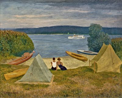 Ein weiteres – noch späteres – kommt in der anstehenden Auktion bei Lehr zum Aufruf. „Die Schwestern“ ist 1928 entstanden, zwei Jahre nach den „Hühnern“. Man sieht ein Interieur mit einem Bett oder Diwan, versehen mit einem Überwurf, im oberen Teil mit Kissen bedeckt, alle unterschiedlich gemustert mit orientalischem Touch. Auf diesem Diwan liegen Bauch an Rücken, eng aneinandergeschmiegt, mit geschlossenen Augen, also wahrscheinlich schlafend, zwei junge, schwarzhaarige Frauen in Unterwäsche, aber mit Strümpfen und Schuhen. Die vordere barbusig, eine Brust ist sichtbar, die hintere im Unterrock oder Negligé. Letztere hat ihren rechten Arm unter denjenigen der vorderen geschoben, ihre Hand liegt auf deren linkem Oberarm. Die vordere Frau liegt am äußersten Rand des Bettes zur Betrachterseite hin, ihr rechtes Bein, das sie über ihr linkes gelegt hat, hängt neben dem Bett schräg nach unten, der Fuß im absatzbewehrten Schuh mit Riemchen über dem Rist (beide Frauen tragen ein ähnliches Modell) ruht auf dem Boden, der Absatz noch auf der Überwurfdecke, die Schuhspitze bereits auf dem Zimmerboden. Beide Frauen haben einen „Bubikopf“ – die in den Zwanzigerjahren für Emanzipation und Selbstbewusstsein stehende, beliebte Frisur. Beide tragen am rechten Handgelenk auch einen goldfarbigen, dünnen Armreif, die vordere noch passende Creolen (man sieht nur ein Ohr) und eine Armbanduhr am linken Handgelenk. Ihre Schultern und Köpfe ruhen auf den ausladenden Kissen am Kopfende des Bettes. Die Schlafhaltung der beiden dürfte vertraut sein – bis auf das exponierte rechte Bein der vorderen.