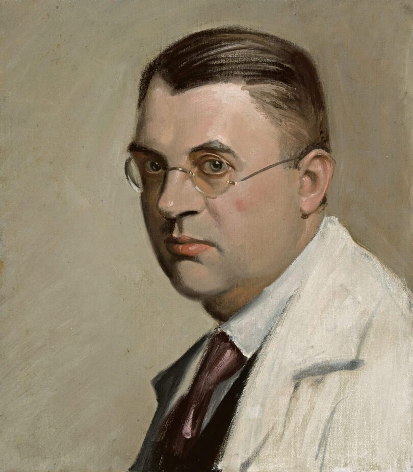 Wie Scholz sich selbst zu dieser Zeit sah, zeigt ein Selbstbildnis in Öl auf Leinwand aus dem Jahr 1929, das ebenfalls bei Lehr offeriert wird. Ernst, forschend und emotionslos blickt er dort durch seine runde, randlose Brille auf den Betrachter. Er ist korrekt gekleidet: weißes Hemd, Krawatte, vermutlich Jackett, darüber ein weißer Arbeitsmantel. Wenn man nicht wüsste, dass es sich hier um einen Maler handelt, könnte dieser Mann auch beispielsweise Arzt sein – oder Psychiater.