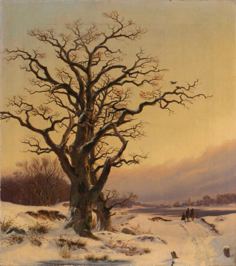 Ruhiger, geradezu still, geht es auf dem Gemälde von Johann Hermann Carmiencke zu, das im Berliner Auktionshaus Bassenge zwei Wochen später für geschätzte 12.000 Euro zum Aufruf kommt. 1830, mit gerade einmal zwanzig Jahren, malte der Hamburger Künstler die verschneite „Winterlandschaft an der Elbe mit drei Reitern“, übrigens auf einer Leinwand, die noch auf den originalen Dresdener Keilrahmen aufgezogen ist. Die Reiter sind bei Carmiencke nur winzige Statisten. Die Hauptrolle spielen die majestätischen Bäume vor dem leuchtenden Abendhimmel. Damals studierte Carmiencke in Dresden bei dem berühmten norwegischen Romantiker Johan Christian Clausen Dahl. Später wurde er Hofmaler des dänischen Königs, bevor er 6000 Kilometer Luftlinie zurücklegte und in Amerika einer der Gründer der Brooklyn Academy wurde.