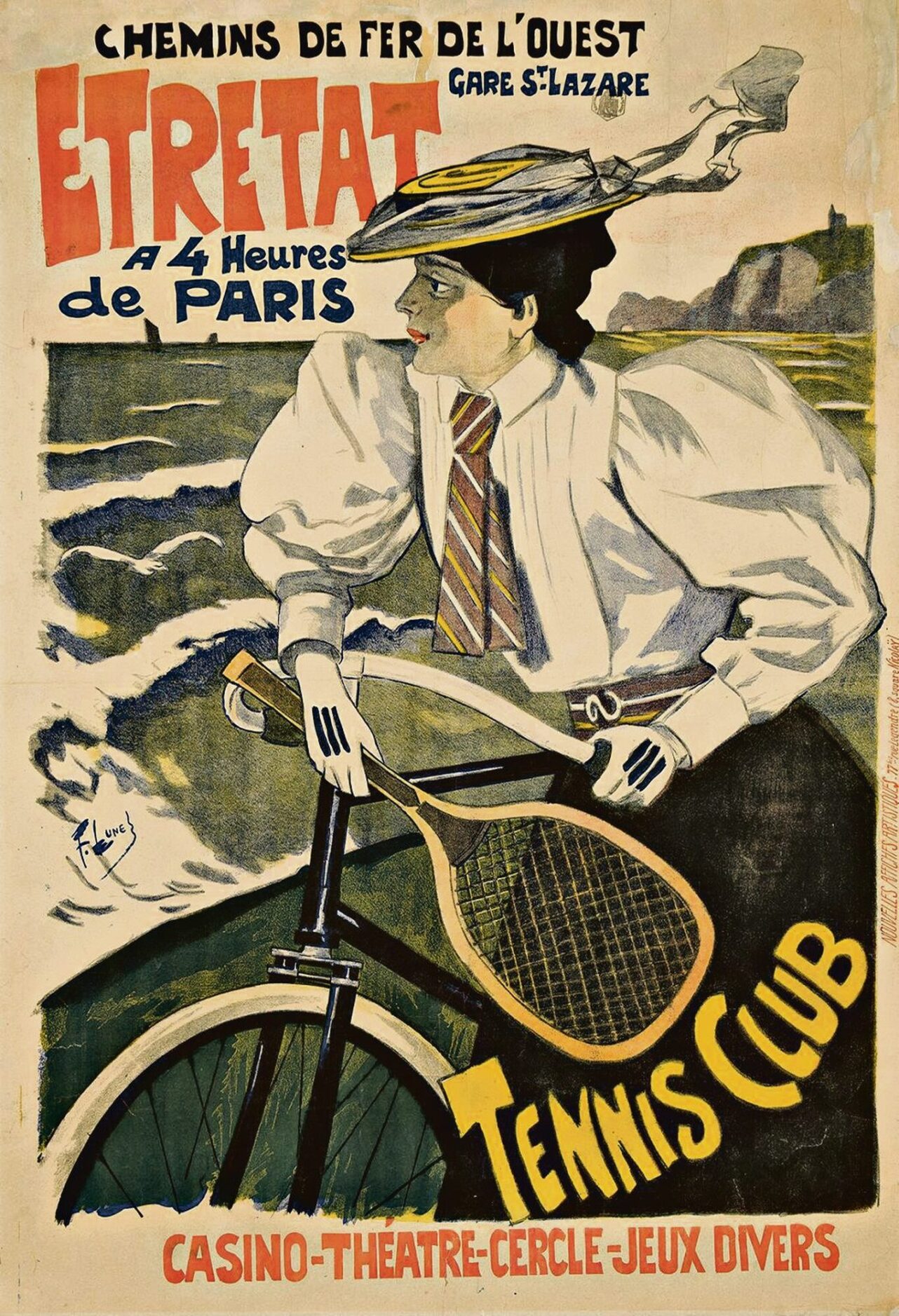Die Auktion gibt sich jedoch nicht nur kriegsverbunden. Wie stets kommt auch die Plakatwelt, die allerhand Annehmlichkeiten verspricht, zu ihrem Recht. Und wenn da „Etretat” zu lesen ist, geht es nicht um die bizarren Felsen an der Küste der Normandie, die als Motiv für Gemälde von Courbet, Delacroix, Monet, Manet, Boudin, Degas etc. dienten. Da wirbt nur eine Radfahrerin samt Racket im Vorder- und den Falaises d’Etretat im Hintergrund für den Tennis Club des Seebades, das mit dem „Chemins de fer de l’ouest a 4 heures de Paris“ zu erreichen sei. Ferdinand Lunel, ein Schüler von Jean-Léon Géròme, dessen Zuschläge für seine Tourismusplakate selten ins Vierstellige vordringen, hat es 1896 entworfen. Bei Swann ist es jedoch auf 2000 Dollar geschätzt.