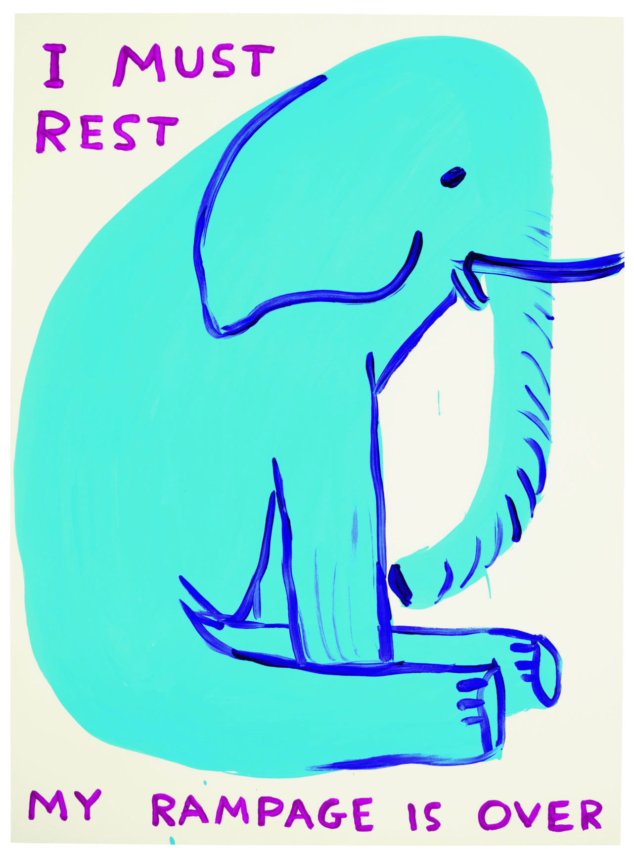 Der Elefant ist müde: 13000 Pfund erzielte David Shrigleys 76 mal 56 cm großer Farbsiebdruck „My Rampage is Over“, der im vergangenen Jahr in einer Auflage von 125 Stück entstand, in der Auktion „Made in Britain“ Mitte März bei Sotheby‘s in London. Das ist ein Rekordpreis für den britischen Künstler und Meister des schwarzen Humors. Die Schätzung betrug nur 1100 Pfund.