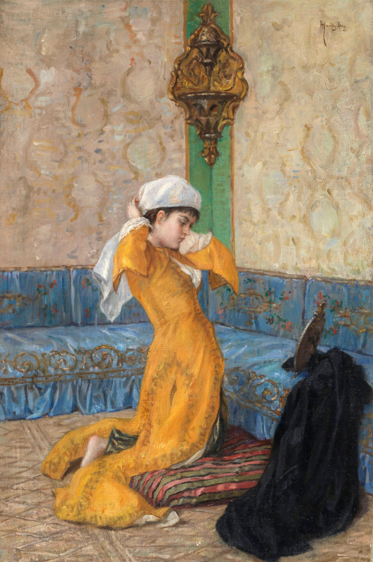 Das Top-Los der Dorotheum-Auktion von Gemälden des 19. Jahrhunderts, Osman Hamdi Beys „Ein Blick in den Spiegel“ wurde Anfang Mai für 1,275 Millionen Euro versteigert. Das um 1880 entstandene Ölbild stellt eine junge Dame in einem opulentem Interieur dar. Sie trägt ein gelbes Gewand und blickt sinnlich in einen Spiegel, während sie ihre weiße Kopfbedeckung zubindet. Der in Paris ausgebildete Osman Hamdi Bey (1842-1910) gilt als Begründer der modernen türkischen Malerei, die Tradition und Moderne sowie westliche akademische Malerei mit östlicher Finesse verband. Es war nach 2019 der zweite Millionenzuschlag für diesen Künstler im Dorotheum. (dpa/Weltkunst)