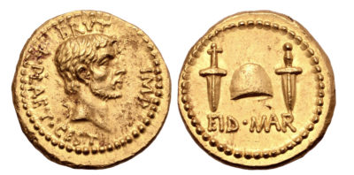Goldene Sensation: Die wohl bekannteste römische Münze, ein Denar des Brutus mit der abgekürzten Aufschrift EID MAR für die Iden des März, verweist auf die Ermordung Cäsars und bildet mit dem Kopf von Brutus auf der Vorderseite einen der Attentäter ab, auf der Rückseite zwei Messer und – als Symbol für Freiheit – ein Pileus, die Filzkappe freigelassener Sklaven im alten Rom. Nur drei Exemplare sind in goldener Ausführung bekannt und schon die deutlich häufigeren Silbermünzen erreichen regelmäßig Rekordpreise. Jetzt hat das Londoner Auktionshaus Roma Numismatics mit einem Zuschlag von 2,7 Millionen Pfund einen neuen Rekord für eine antike Goldmünze erzielt.