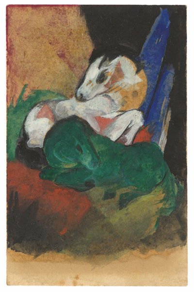 Könnte es sogar ein Rekordzuschlag werden? Erhöhtes Interesse und erbitterte Bietergefechte sind programmiert, wenn gemalte Postkarten von Franz Marc aufgerufen werden. Marc malte das Werk bereits 1913, zunächst ohne es zu verschicken. In der dann am 8. November 1915 wenige Monate vor seinem Tod versandten Karte spricht der Künstler von dem Wunsch, einmal nach Bonn zu Besuch zu kommen. Die Zeilen drücken Verbundenheit, Wehmut und Trost aus. Der Schätzpreis für das erschütternde Dokument, das gleichzeitig ein wichtiges Kunstwerk des 20. Jahrhunderts darstellt, liegt bei Grisebach in Berlin in der Auktion am 27. bis 30. November bei sehr moderat angesetzten 250 000 bis 350 000 Euro.