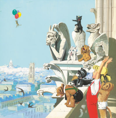 Mit insgesamt 44 Alben hat der 2007 verstorbene Schriftsteller Pierre Probstseit 1953 Kinder mit der Selbstständigkeit des etwa achtjährigen, sehr weiblich akzentuierten Blondschopfs Caroline begeistert. Bieter können bei Artcurial in Paris am 23. November mit einer gouachierten Bleistiftzeichnung aus dem Jahr 1979 in luftige Höhen steigen: Caroline steht zwischen Wasserspeiern auf dem Turm der Pariser Kathedrale Notre Dame und winkt einem an Ballons davonschwebendem Kätzchen nach. Angesichts der Aufmerksamkeit um die in diesem Frühjahr ausgebrannte Kathedrale sind 3000 Euro niedrig taxiert.