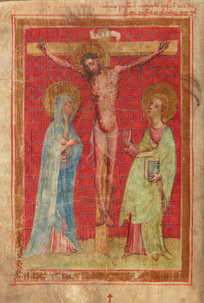 Bei Venator & Hanstein fällt am 28./29. September ein Los aus dem 15. Jahrhundert ins Auge. Laut Widmungsvermerk ist eine seltene‚ ungefähr 300 Seiten starke Missale Coloniense auf das Jahr 1420 datiert. Das für den Gebrauch im Erzbistum Köln eingerichtete und für die Kirche in Erpel gestiftete Messbuch ist, wie für diese Epoche typisch, sehr sparsam bebildert. Umso auffallender ist das Kanonbild, eine Kreuzigung mit Maria und Johannes vor rotem ornamentalem Hintergrund (Schätzpreis 20 000 Euro).