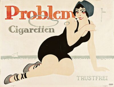Bei Swann in New York kommen am 3. August Vintage Poster zum Aufruf – darunter auch die „Problem Cigaretten“, für die kokett rauchend eine junge Frau im schwarzen Badeanzug wirbt