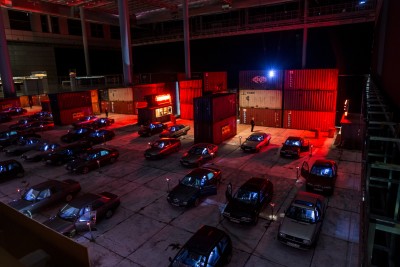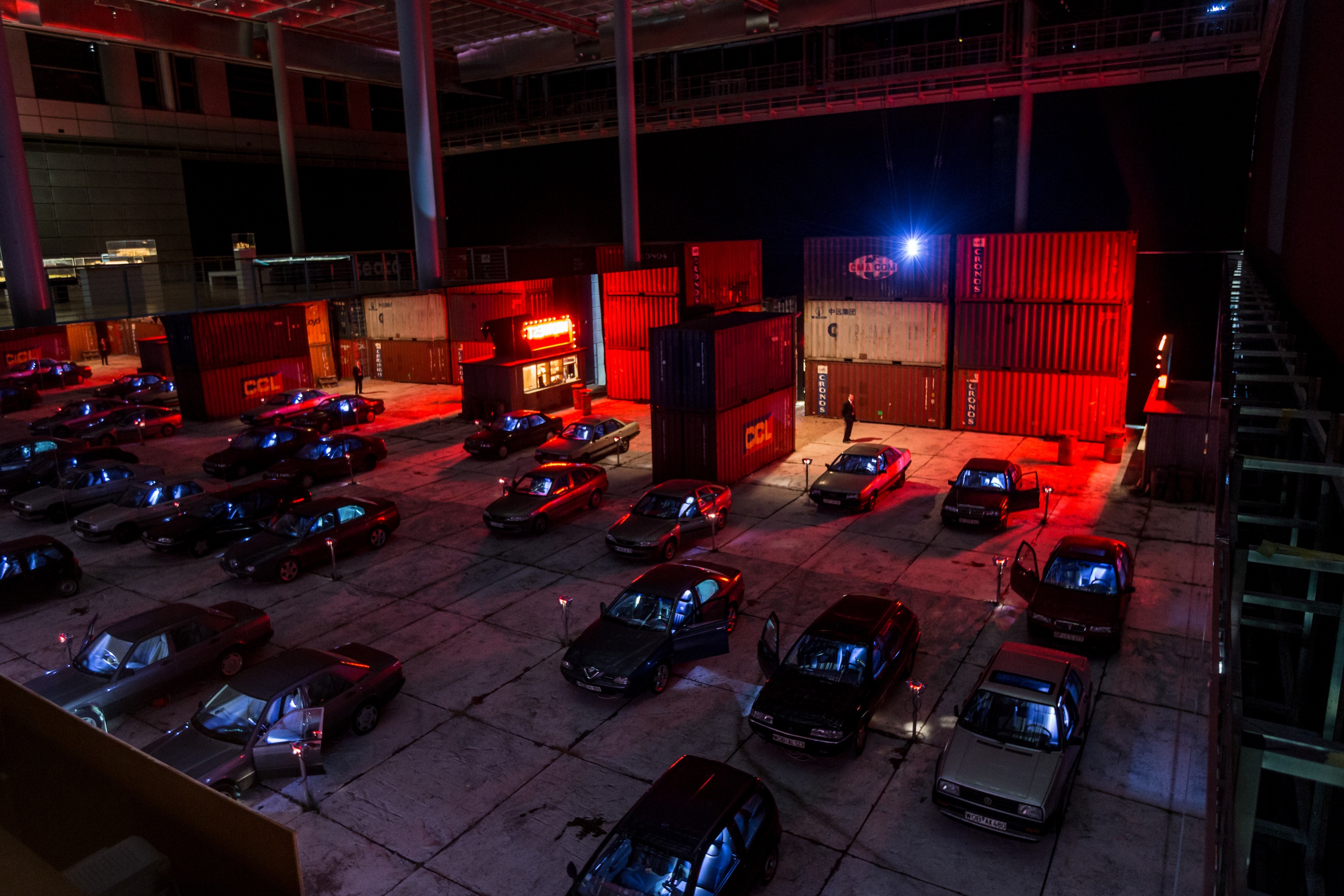 Im Museum scheint sich dann der Außenraum übergangslos fortzusetzen: In der großen Halle sind Container gestapelt. Vorbei an Stahlwänden läuft der Betrachter über einen sandigen Pfad und erreicht einen etwas verwahrlosten Hof, auf dem ein Dutzend Autos in lockerer Ordnung geparkt stehen. Ein Film flimmert auf einer riesigen Leinwand. Julian Rosefeldts Autokino-Installation „Midwest“ scheint ihre glamourösen Tage von Beginn an hinter sich zu haben. Hat man erst hinter einem der Lenkräder Platz genommen, bestätigt sich der Verdacht. Der Film des Berliner Künstlers zeigt einen Containerlagerplatz, auf dem Straßenkreuzer und harte Männer mit Schusswaffen umeinanderkreisen. Koffer werden zwischen den Gruppen sinnlos getauscht. Immer wieder gerät die Handlung abrupt ins Stocken. Die ganze Choreografie ist eine große logistische Panne, sinnbildlich bezogen auf den globalen Warenverkehr. Steckt in Rosefeldts Werk eine Prophezeiung? Droht der VW-Stadt in der Krise das gleiche Schicksal wie den amerikanischen Industriestädten des „Rust Belt“? Wie Detroit, Cleveland, Pittsburgh?