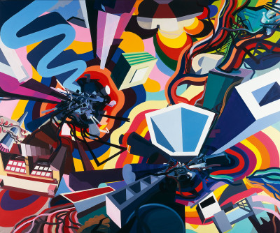 Wie das Leben vollends in Kunst kristallisiert, offenbart sich bei der Erkundung des Obergeschosses. Kaum ist man durch die Tür getreten, wird der Blick durch den farbigen Strudel auf Franz Ackermanns Gemälde „evasion XVII“ (1998) angesogen. Kabelstränge, Fenster, Fabriken und Hochhaustürme wirbeln durch- und umeinander. Entweder hat sich der Planet Erde hier noch gar nicht verfestigt, oder er hat seine erkennbare Form schon wieder verloren, wurde von seinen Fliehkräften auseinandergetrieben. Dagegen wirkt der Roboter von Nam June Paik („Andy Warhol Robot“, 1994), der der Ackermann-Galaxie furchtlos entgegentritt, recht standfest. Kein Wunder, steht er doch mit Gliedmaßen aus neun flimmernden Fernsehern für die Musealisierung der Kunst ein.